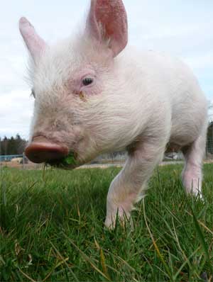 | Ziggy Spring 2011 Ziggy arrives at Pigs Peace Sanctuary Calls reporting abuse started flowing in when a three-legged piglet first arrived at a roadside zoo in Canada. She was considered a freak of nature with many anxious to see her. Her living quarters were barely big enough to turn around in. She was fully exposed to the cold winter weather of 20°F with no bedding! The plan at the zoo was to feed her to the lions when she lost her cuteness! As soon as we heard of her, plans were made to get her to safety and love at Pigs Peace Sanctuary. Born with three legs Ziggy does not know any other life. She is up and about like all pigs ready for breakfast eery morning. Ziggy is growing fast and will be a large pig. Due to genetic breeding of the domestic pig her size may limit her ease of mobility. Today she lives as a people greeter in the yard with a group of wonderful senior pigs. Ziggy and Pilgrim the horse love each other. Pilgrim was rescued off the slaughter bound truck years ago and lives as a senior horse at the sanctuary with dietary restrictions. Daily he gets time in the yard to eat grass. When he first saw Ziggy he was curious and she was too. Now every day they will be found hanging out together.